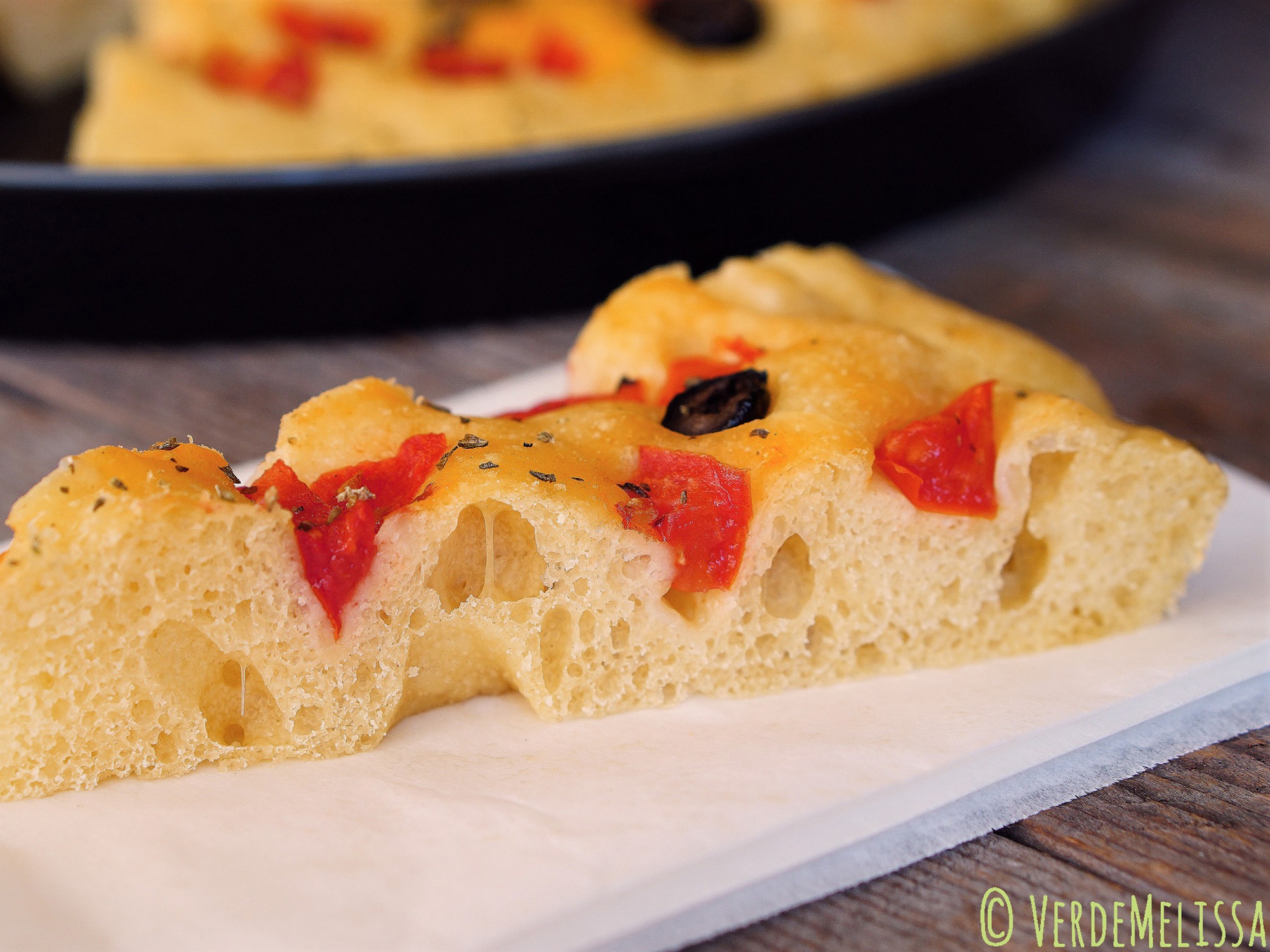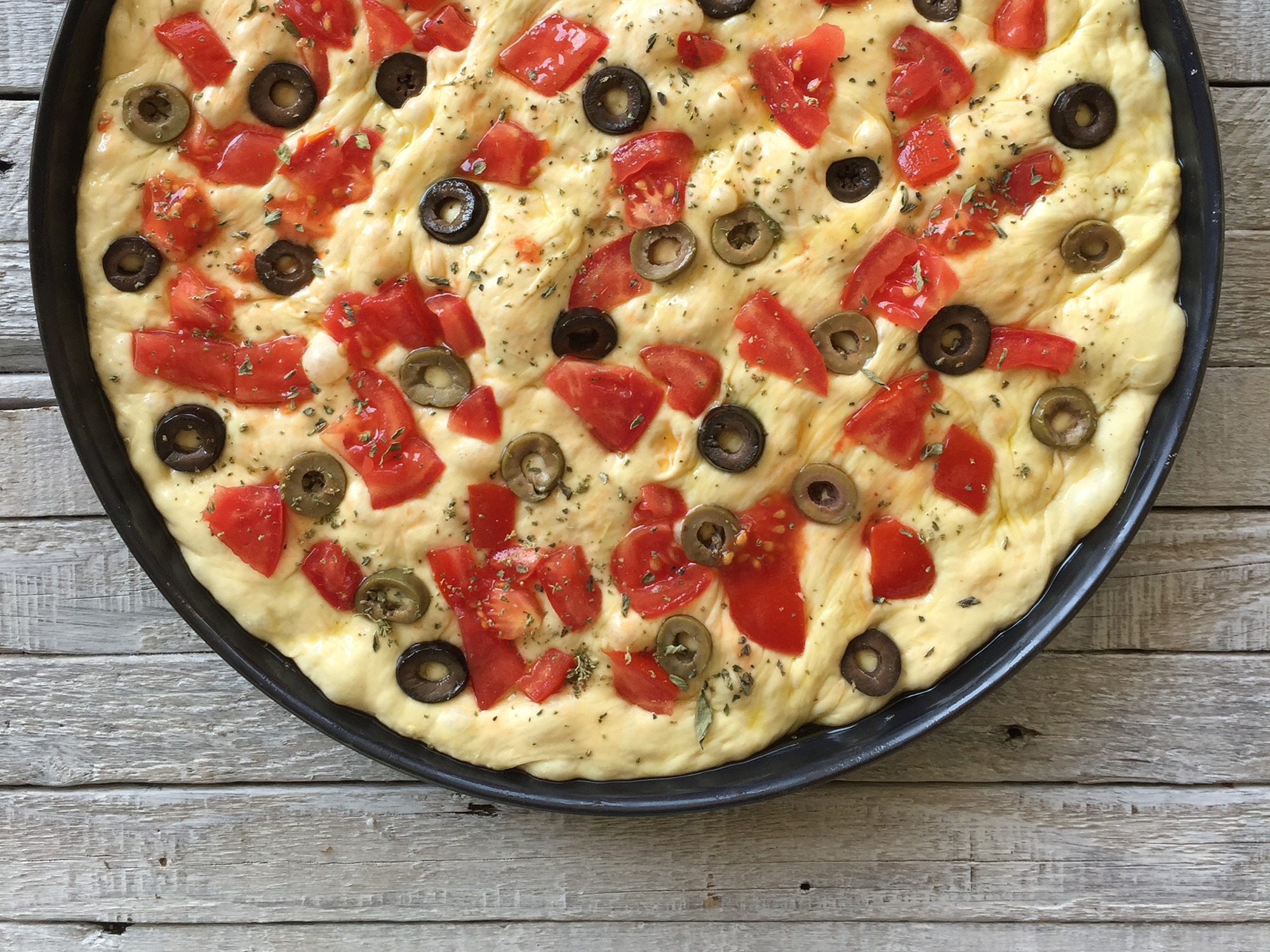 Knead until the dough forms a smooth and elastic ball, tip it onto an oiled bowl and cover it with some cling film or a damp cloth. Leave the dough to rise at room temperature for about 2-3 hours, or until it doubles in size. - Transfer the dough on a floured surface and roll it out with your fingers, then place it on our 30 cm round blue-iron pan. Top the focaccia with round sliced olives, diced tomatoes, oregano and leave to rest for at least 30 minutes.